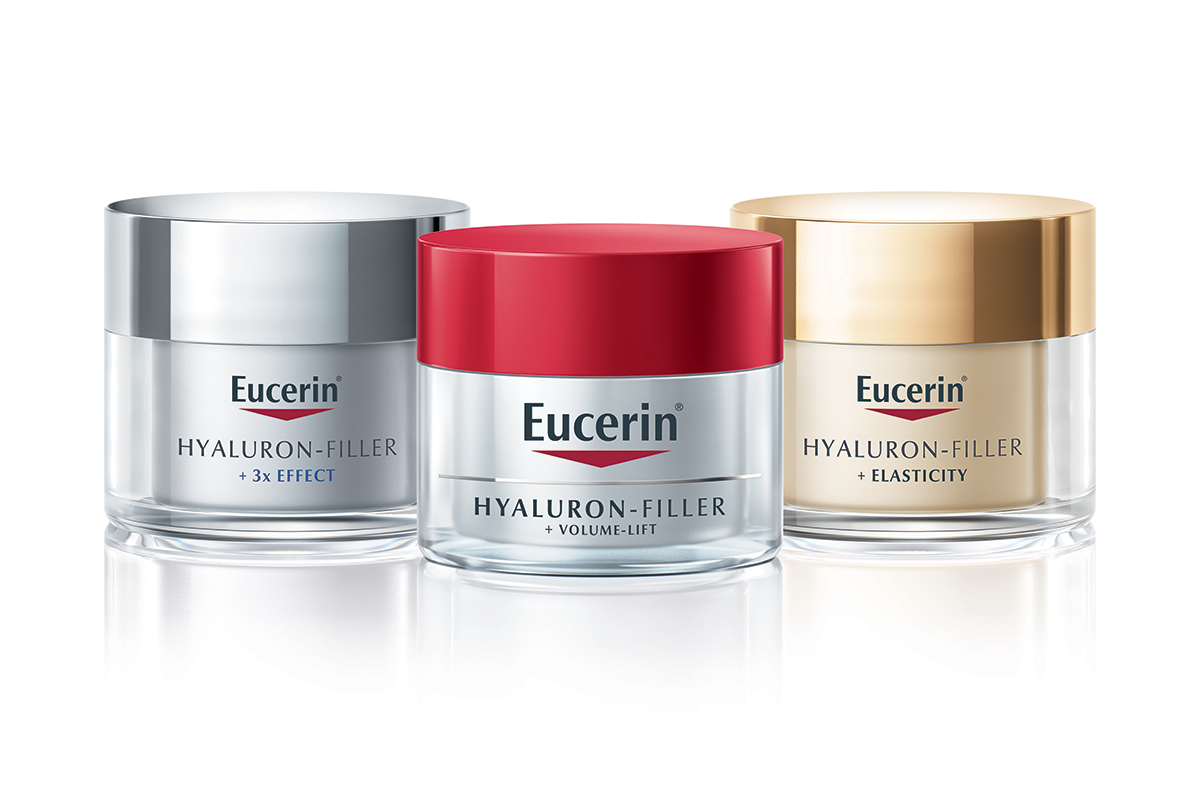 Formulacije Eucerin® anti-age linija, koje su danas deo dnevne rutine nege miliona dama u svetu, došle su iz Eucerin® laboratorija, kasnije Istraživačkog centra, kao velike inovacije na polju nege kože. Jedna od najistaknutijih među njima je Eucerin®Hyaluron-Filler linija, koja je 2006.godine napravila veliki korak napred za celu dermokozmetičku industriju. Formulacija ove linije i dalje je jedinstvena po tome što sadrži Eucerin® patentiranu kombinaciju hijaluronske kiseline dugog lanca, koja aktivno deluje na popunjavanje površinskih bora i hidrataciju površinskog sloja kože, i hijaluronske kiseline kratkog lanca, koja ima 40 puta manju molekulsku masu i prodire u dublje slojeve kože, obezbeđujući dubinsku hidrataciju i popunjavanje dubokih bora.
