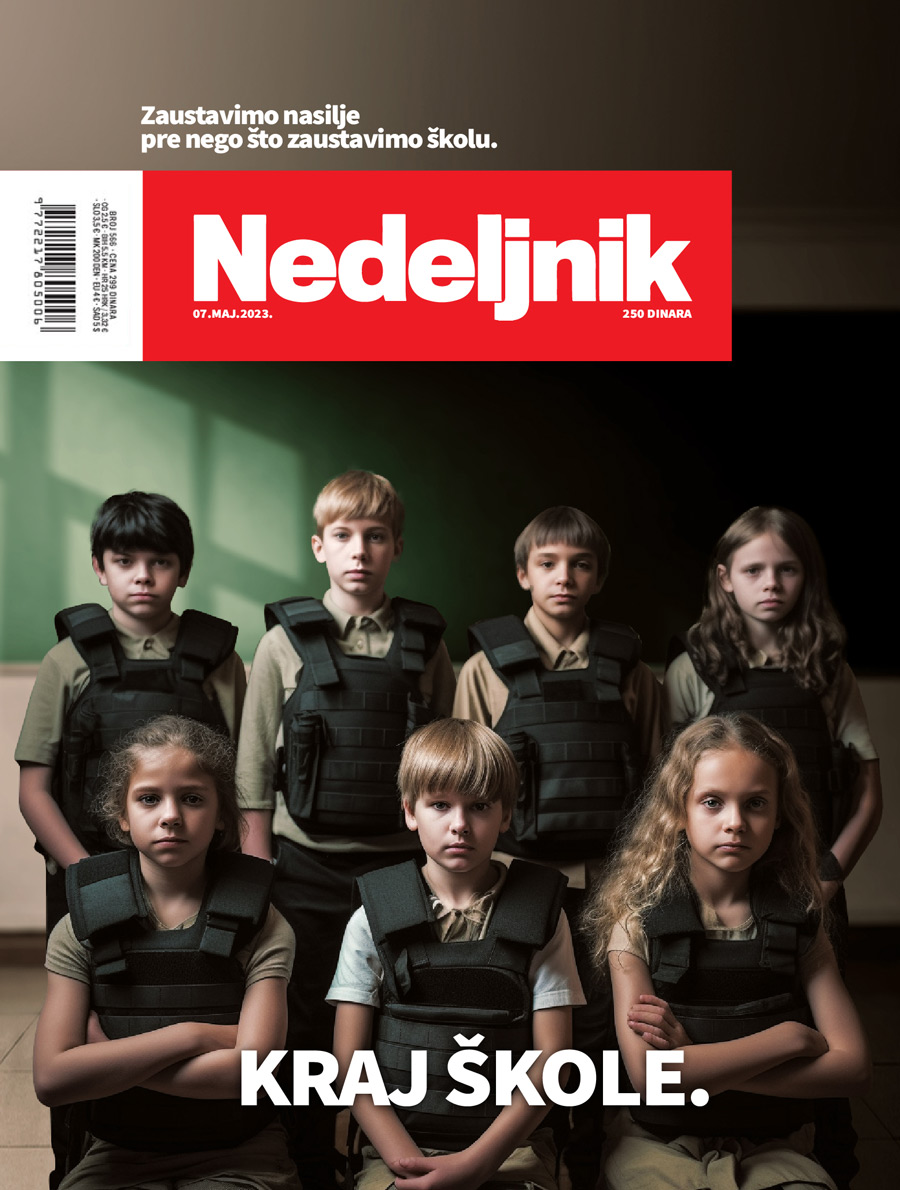 Rad „Kraj škole“, kreiran uz pomoć veštačke inteligencije sa nepostojećim likovima, predstavljao je reakciju na tragični događaj u beogradskoj osnovnoj školi maja ove godine i objavljen je na naslovnoj strani magazina Nedeljnik.