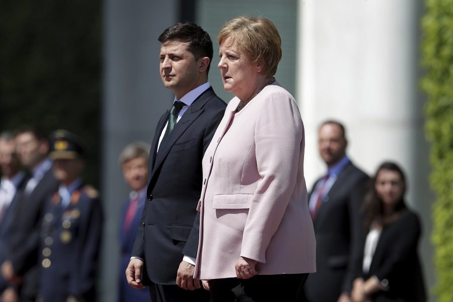 Nakon intoniranja himni, kancelarka je izgledala bolje dok je ulazila u zgradu kancelarijata sa Zelenskim, i kazala je novinarima na pres konferenciji da se oseća dobro.