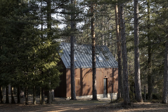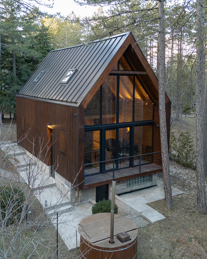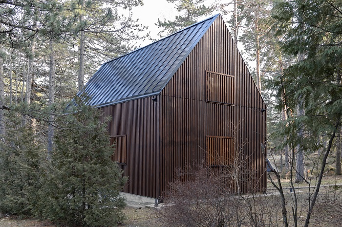 Lokacija kuće je u blizini puta, ali je orijentisana tako da obezbeđuje privatnost korisnicima od spoljašnjih pogleda. Osmišljena je kao vikendica jednostavne forme sa dvovodnim krovom, koja zadovoljava potrebe savremenog načina života. Nalazi se na zakošenom terenu i celom zastakljenom stranom okrenuta je ka netaknutoj prirodi nacionalnog parka. Zauzima ukupnu površinu od 85 kvadratnih metara, i ima galerijsku formu, tako da je u prizemlju formiran otvoren prostor, koji objedinjuje dnevni boravak, kuhinju i trpezariju.