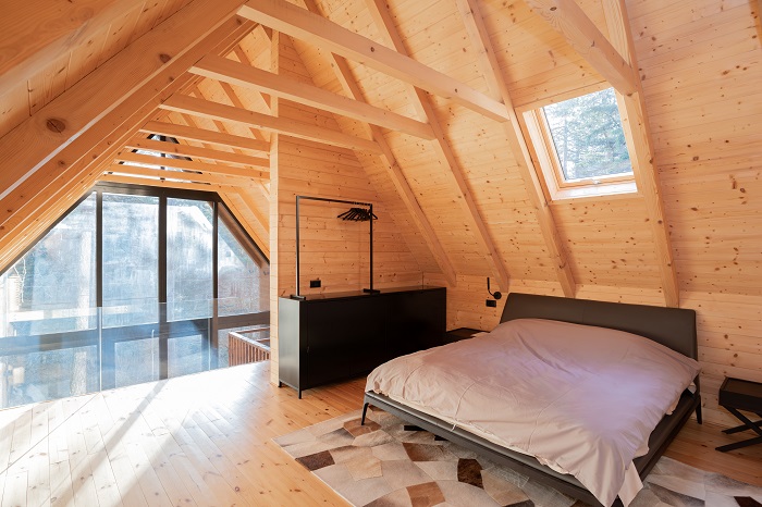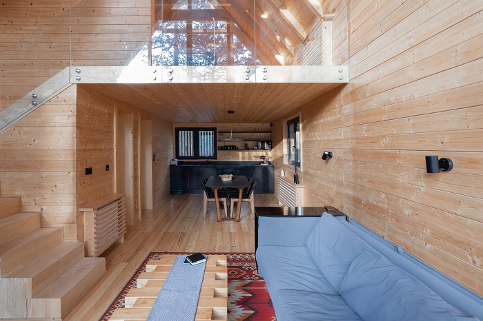 Galerija, na kojoj se nalazi velika spavaća soba, povezana je sa ostatkom prostora i okolnom prirodom staklenim ogradama i krovnim prozorima. Za potpuni ugođaj, u prostoru ispod kote nula formirana je sauna.