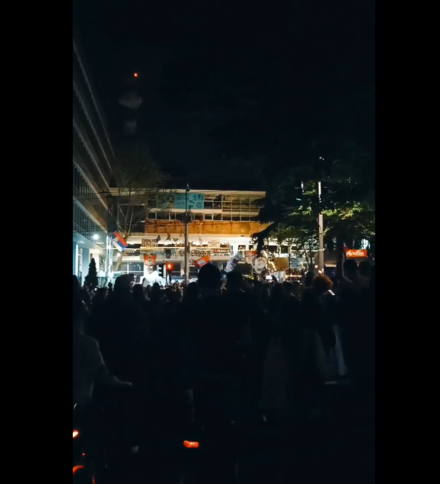 Na zgradi RTS su postavljeni transparenti s natpisima „RTS – Radiotelevizija studenata“, „Ko se boji tišine?“, „Bez revolucije nema evolucije“ a okupljeni nose državne i zastave fakulteta.