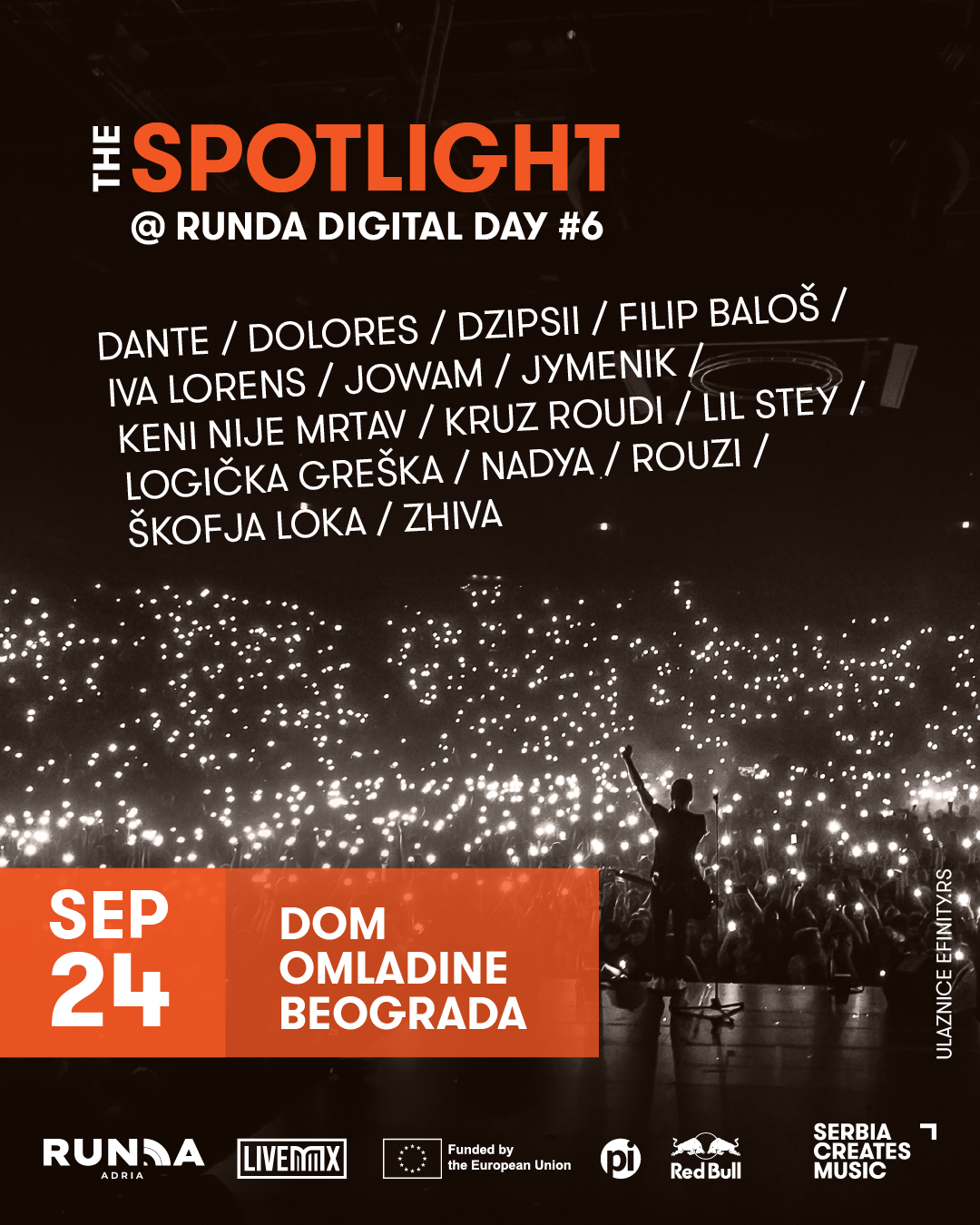 The Spotlight biće održan 24. septembra u Domu omladine Beograda, s početkom u 20 časova, kao zvaničan muzički program u okviru šestog izdanja Runda Digital Day konferencije, koju organizuje Regionalno udruženje nezavisnih diskografa (RUNDA). Na dve bine – u sali Amerikana i u klubu DOB-a nastupiće više od 15 izvođača, uključujući spotlajtere iz dve generacije pobednika nacionalnog muzičkog konkursa „Serbia Creates: The Spotlight“. Priliku da se predstave muzičkim profesionalcima iz celog sveta imaće Dante, Dolores, Dzipsii, Filip Baloš, Iva Lorens, Jowam, Jymenik, Keni nije mrtav, Kruz Roudi, Lil Stey, Logička greška, Nadya, Rouzi, Škofja Loka i Zhiva.