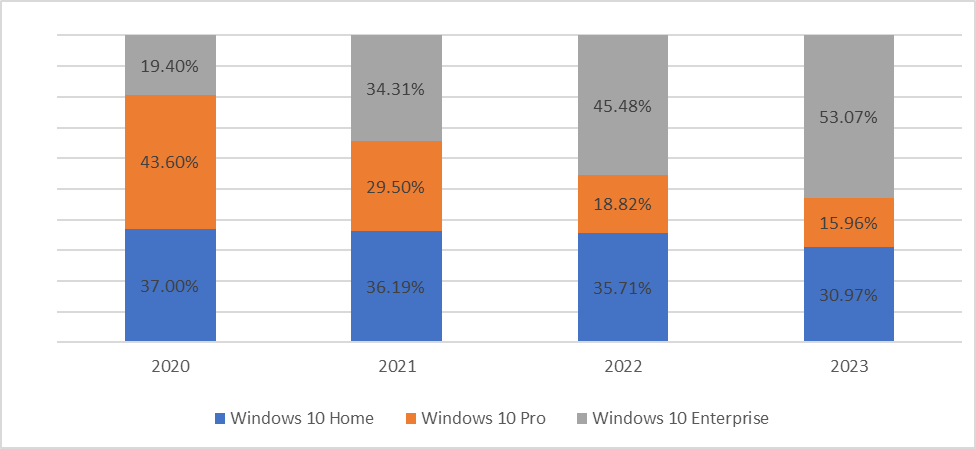 Stručnjaci su prošle godine zaključili da je svaki drugi zaraženi uređaj (53%) bio poslovni, a na osnovu podataka, najveći udeo ovih malvera pronađeni su u Windows 10 Enterprise. Tabela ispod pokazuje koliko su različite verzije Windows 10 bile pogođene malverima u periodu od 2020. do 2023. godine.