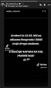 U prvoj je podelio fotografiju sa ulica Beograda, uz poruku: „Stanite uz studente i Srbiju“, a u drugoj je podelio objavu navijača Partizana: