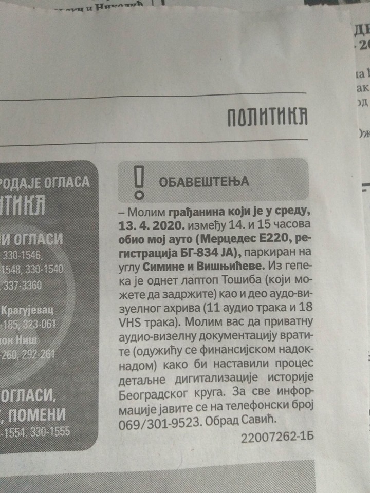 „Molim građanina koji je u sredu, 13.4.2020. između 14 i 15 časova obio moj auto (Mercedes E220, registracija BG-834 JA), parkiran na uglu Simine i Višnjićeve. Iz gepeka je odnet laptop Tošiba (koji možete da zadržite), kao i deo audio-vizuelnog arhiva (11 audio traka i 8 VHS traka). Molim vas da privatnu audio-vizuelnu dokumentaciju vratite (odužiću se finansijskom nadoknadom) kako bi nastavili proces detaljne digitalizacije istorije Beogradskog kruga“.