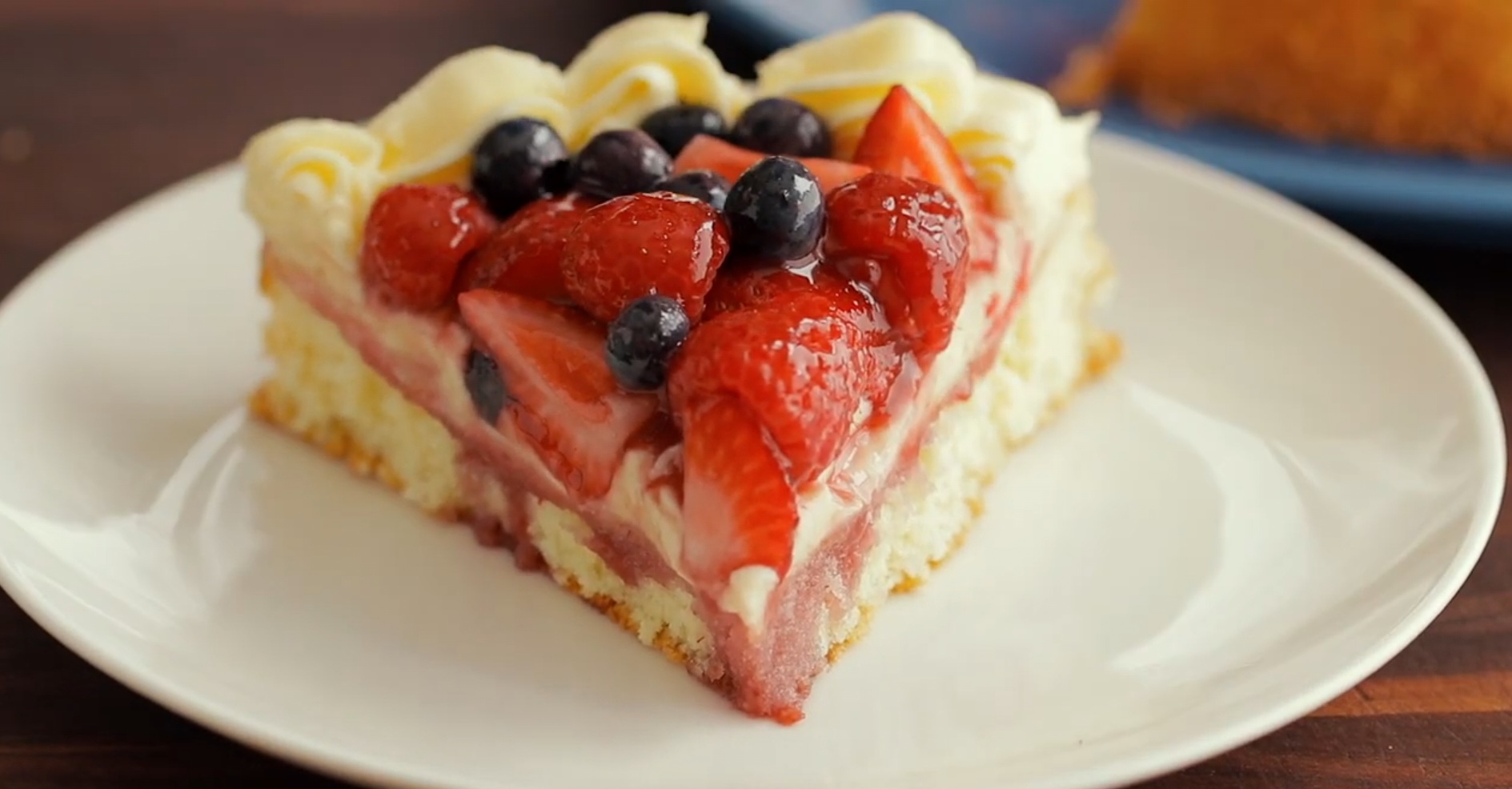 Mirisna voćna krempita s hrskavom korom i sočnim slojem maskarpone-krema, prekrivena šarenim miksom svežeg voća i sjajnim prelivom, savršena je poslastica za letnje dane — prosto i elegantno rešenje kada želite da oduševite ukusom i izgledom.
