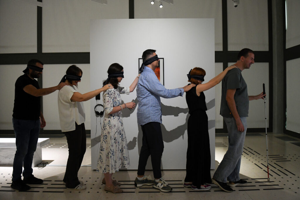 Vođenje na neviđeno kroz „Plavu izložbu“ odvija se tako što videća publika stavi poveze na oči, koristeći taktilne staze za kretanje kroz prostor izložbe i prateći uputstva vodiča Borisa Dončića, upušta se u avanturu višečulne šetnje i jedinstvenog iskustva.