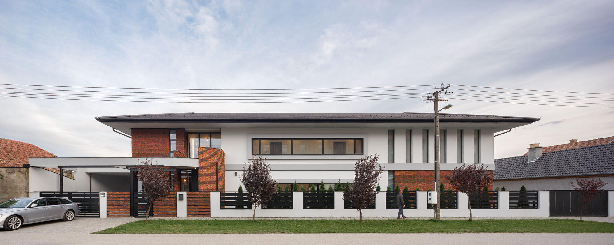 Lučni vetrobran od dekorativnih cigala zaklanja od pogleda s ulice glavni ulaz u kuću. U ulaznom holu nalazi se stepenište koje velikom zastakljenom površinom ostvaruje vizuelnu vezu sa dvorištem. U prizemlju se dalje pristupa prostranom i otvorenom dnevnom boravku koji dostiže visinu od dve etaže. Tu se nalazi drugo stepenište koje vodi do noćne zone na spratu, čime je omogućeno kružno kretanje kroz kuću.