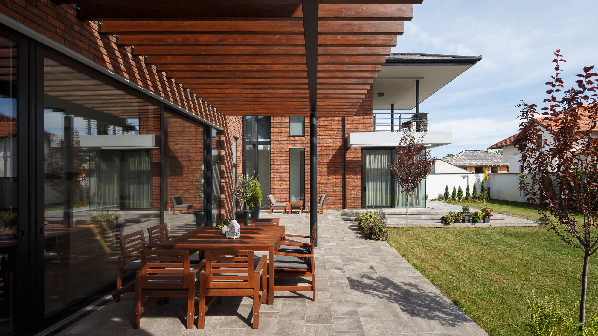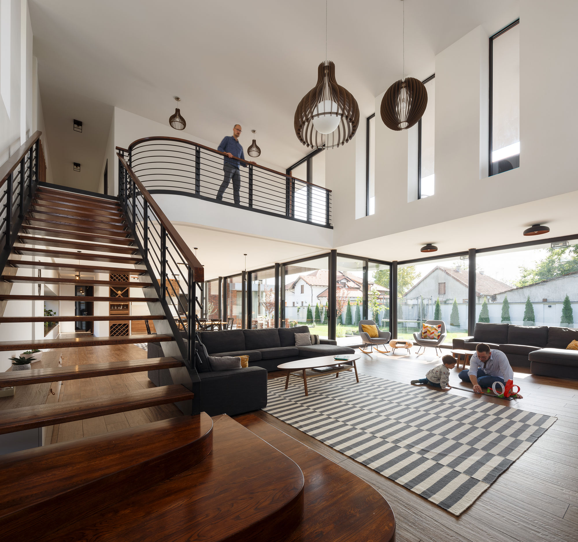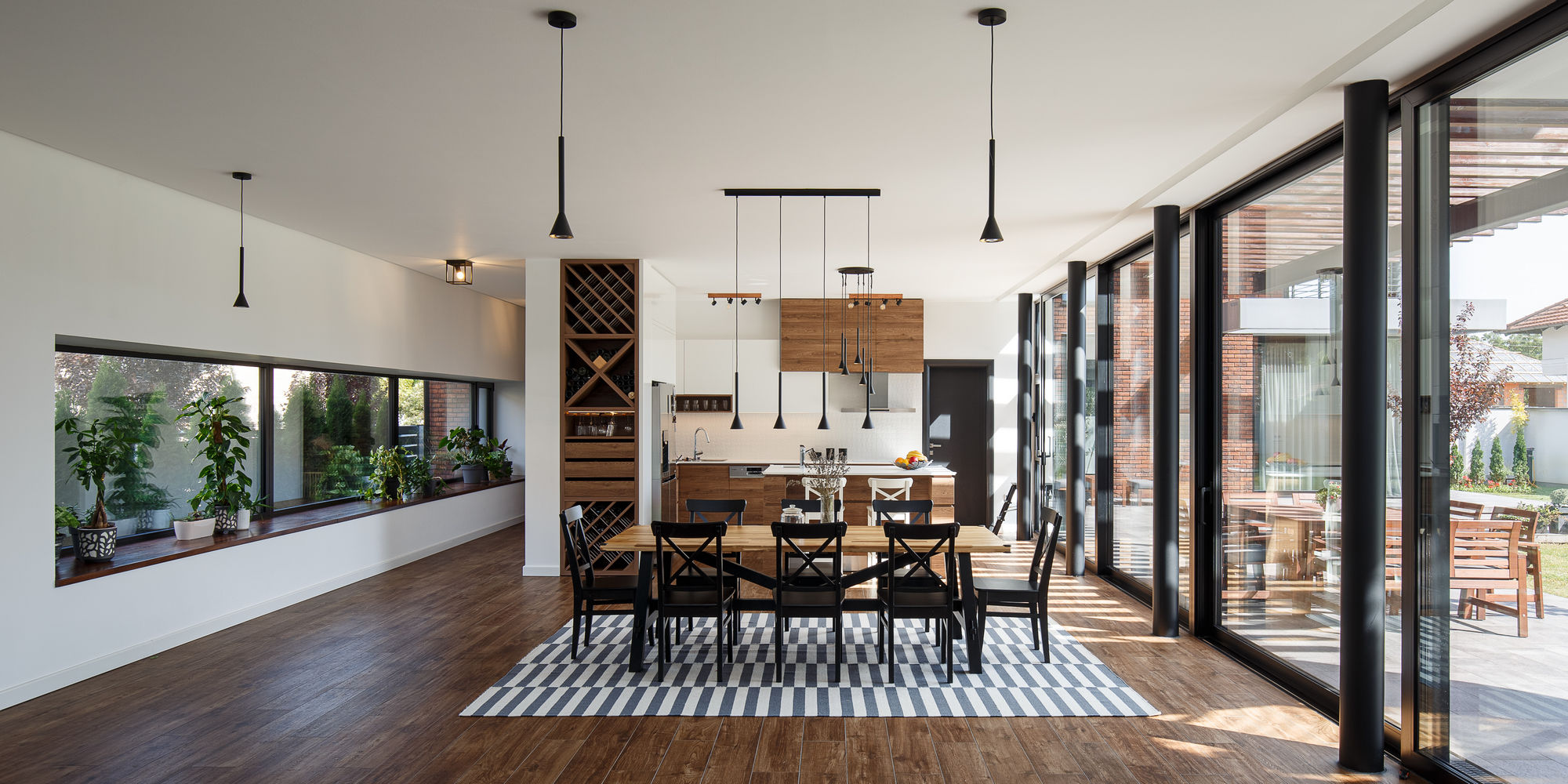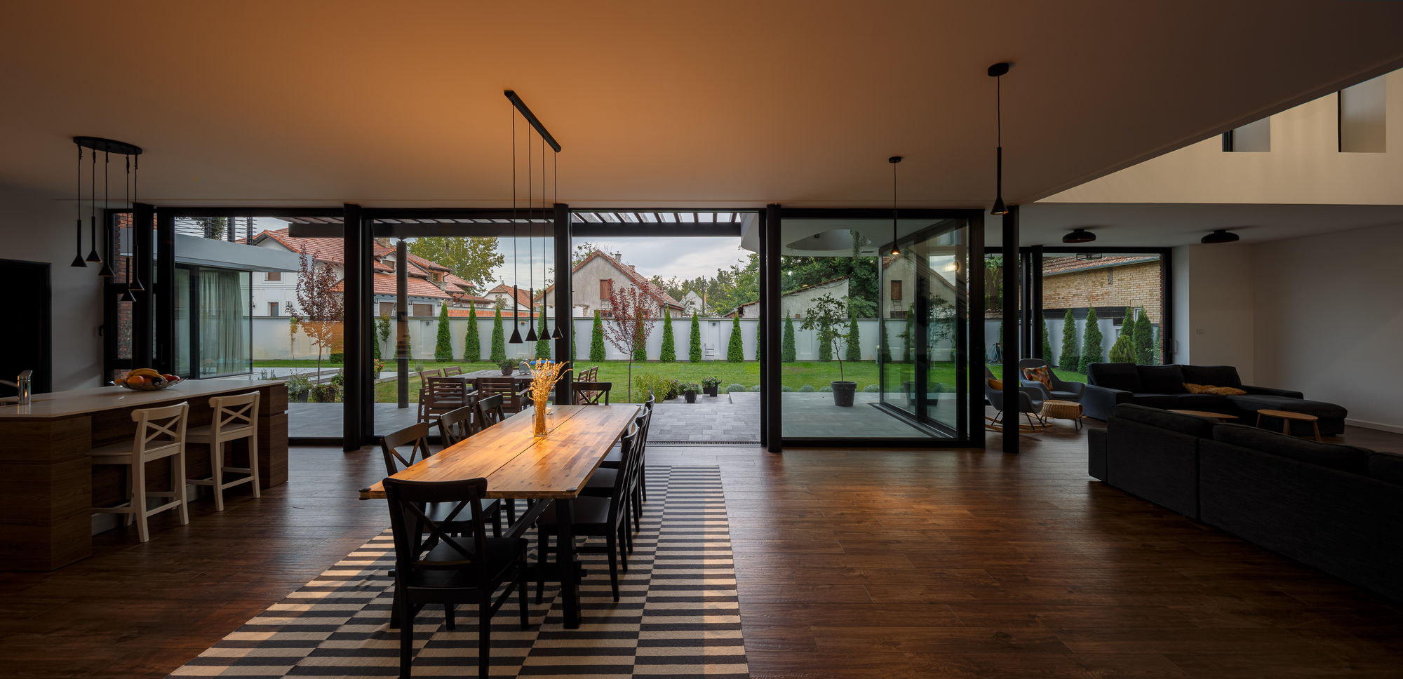 Dnevni boravak sa trpezarijom i kuhinjom zauzima najveći deo prizemlja, dok veliki stakleni klizni otvori povezuju unutrašnji prostor sa spoljašnjim, obezbeđujući dovoljnu količinu dnevne svetlosti u enterijeru. Dinamična igra svetlosti i senke prisutna je tokom čitavog dana, kako u enterijeru, tako i u eksterijeru, zahvaljujući pergolama koje se nalaze u zoni kuhinje i trpezarije.