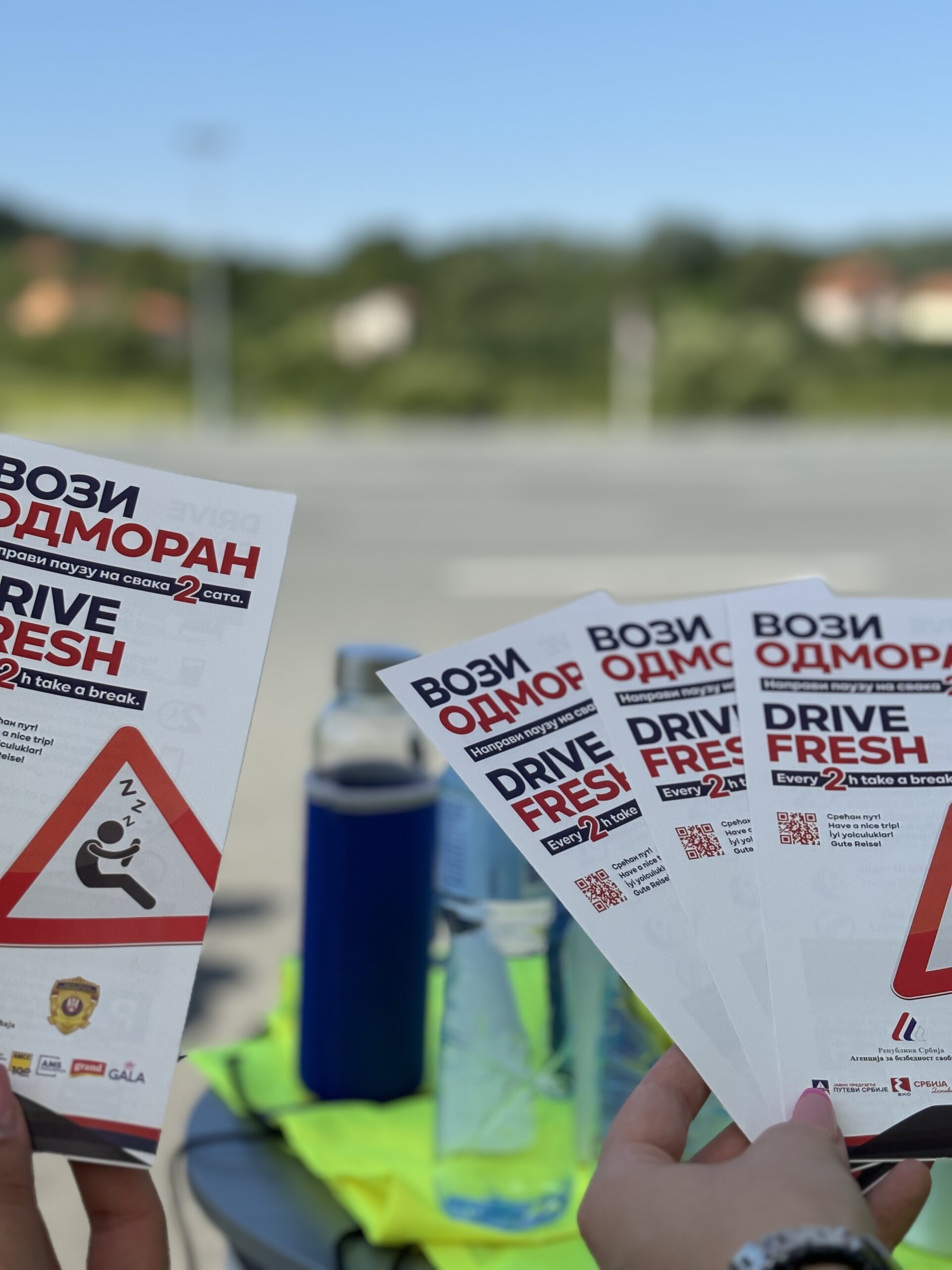 Promo tim i predstavnici institucija – partnera kampanje „Vozi odmoran“, podelili su učesnicima u saobraćaju promotivni materijal sa porukama kampanje na četiri jezika i preneli ključne poruke za bezbedno učestvovanje u saobraćaju.