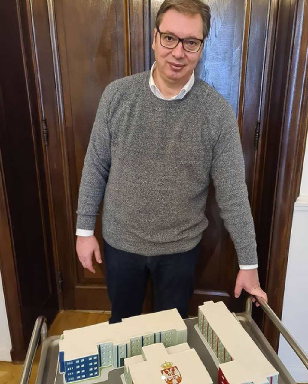 Predsednik Srbije Aleksandar Vučić objavio je na Instagram profilu da je od firme „Termomont“ dobio tortu u obliku nove kovid bolnice u Kruševcu.