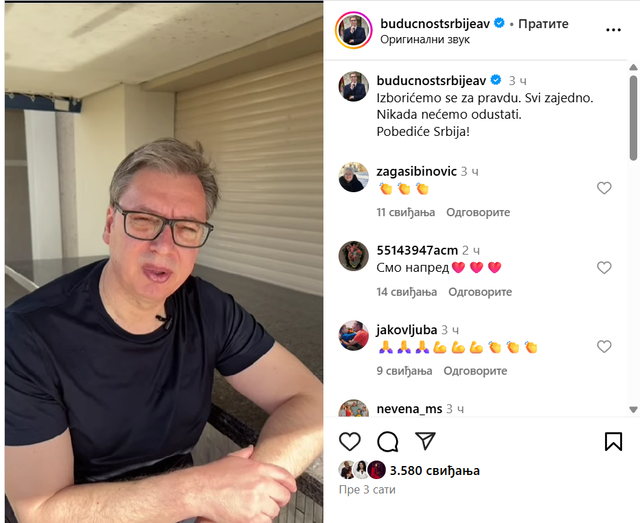 „Zato moramo i možemo samo zajedno da se izborimo. Pobedićemo i korumpirane tužioce i sudije i sve koji ne dozvoljavaju da pravda bude zadovoljena. Živela Srbija!“, završio je Vučić video izjavu.