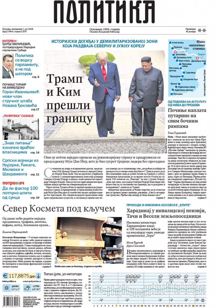 TRAMP I KIM – Američki predsednik Donald Tramp postao je prvi šef Bele kuće koji je došao na teritoriju Severne Koreje nakon što je prešao demilitarizovanu zonu i rukovao se sa severnokorejskim liderom Kim Džong Unom.
