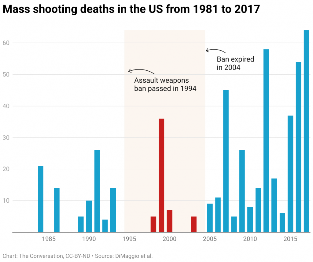 Podaci pokazuju skoro nesumnjiv – i strmoglav – porast masovnih ubistava u godinama nakon što je zabrana kupovine jurišnog oružja istekla 2004. godine.