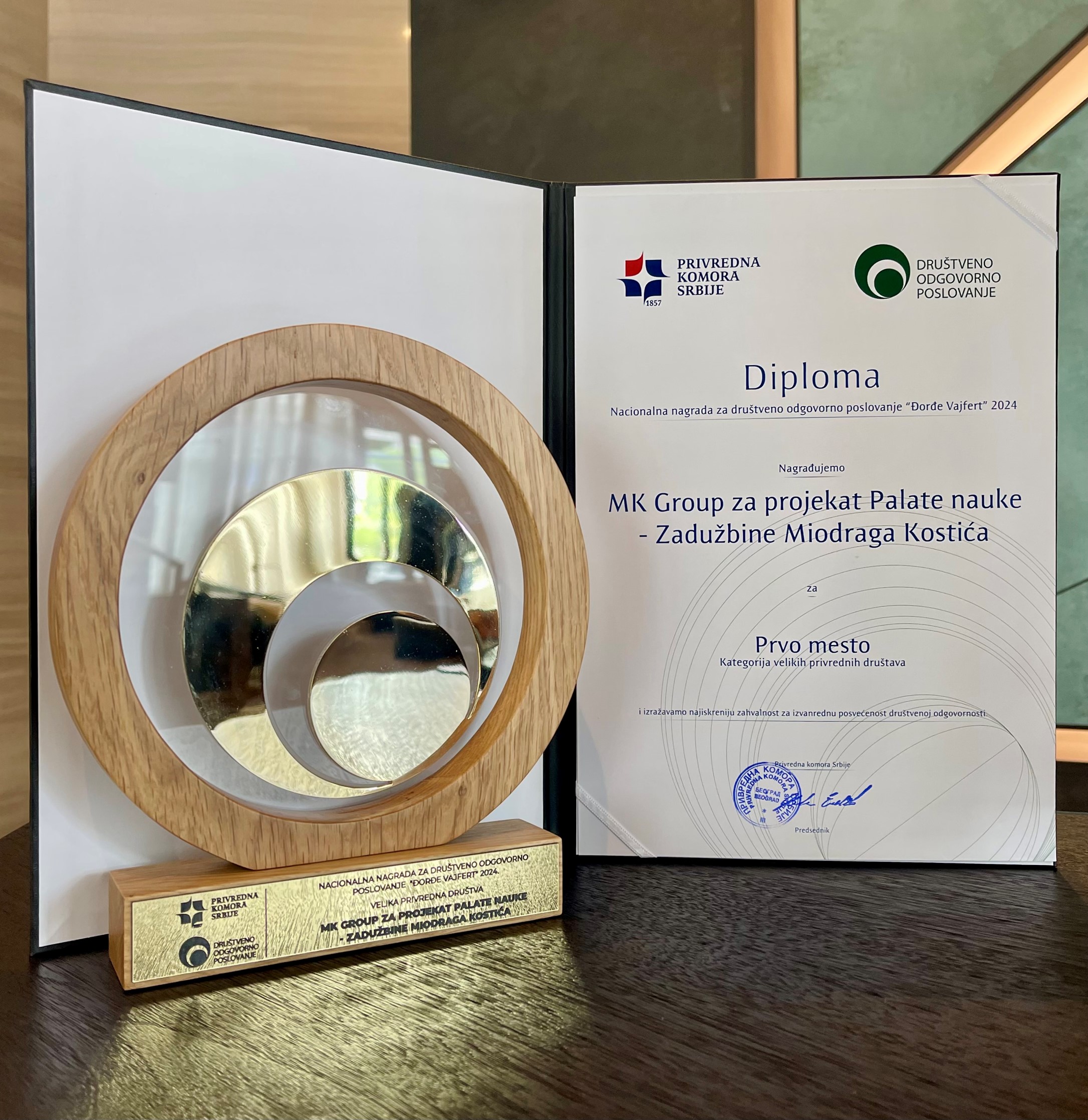Kompanija MK Group i projekat Palata nauke dobitnici su prestižne nacionalne nagrade „Đorđe Vajfert” za 2024. godinu koju Privredna komora Srbije dodeljuje jubilarni deseti put. Ovaj projekat osvojio je prvo mesto.