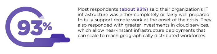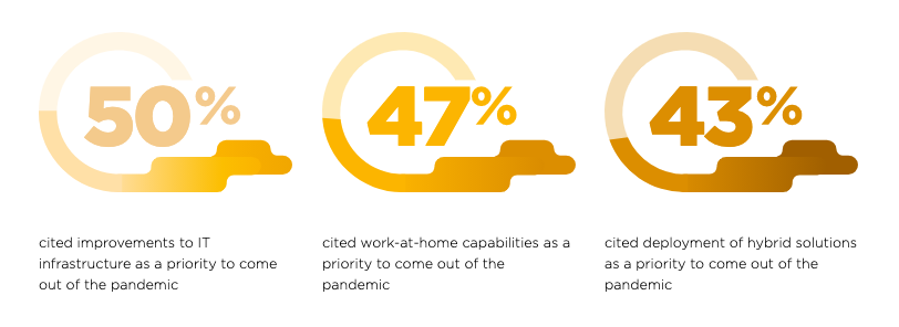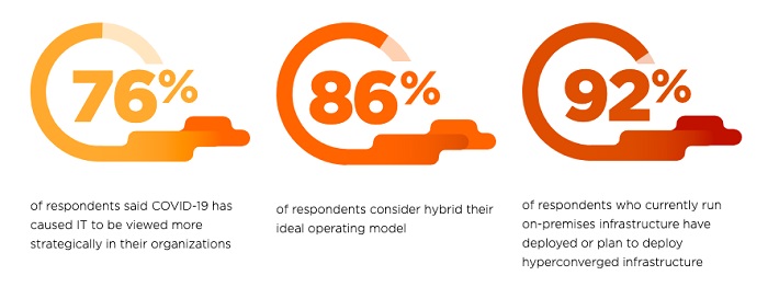Pandemija je pomerila fokus IT-a u pravcu podrške radniku od kuće i omogućavanju skoro pa trenutna rešenja koja mogu stići do geografski udaljenih radnika, podržavajući tako poslovanje razvojem cloud rešenja. Uz to, veliki broj ispitanika koji koristi hibridna okruženja je izjavio kako je veća verovatnoća da će ponuditi fleksibilniji način rada, ojačavajući tako svoje planove za nastavak poslovanja, čineći operacije jednostavnim i povećavajući udeo korišćenje digitalnih konferencija zbog pandemije.