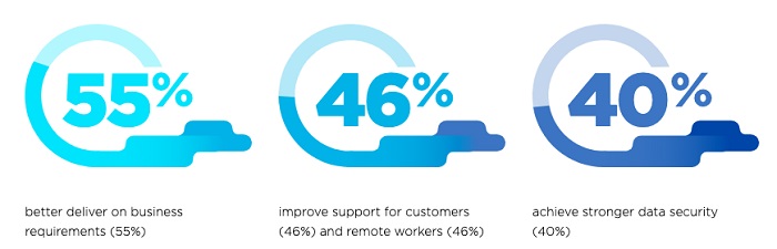 · Ishod strateškog poslovanja pokreće promene mnogo više nego ekonomija: Ispitanici kažu da su njihovi primarni motivi za modifikovanje svoje IT infrastrukture veća kontrola svojih IT resursa (58%), postizanje fleksibilnosti kako bi se uspešno izašlo na kraj sa dinamičnim zahtevima poslovanja (55%), i poboljšanje podrške za korisnike i zaposlene koji rade na daljinu (46% respektivno). Sa druge strane, samo 27% je pomenulo smanjenje troškova kao motivaciju.