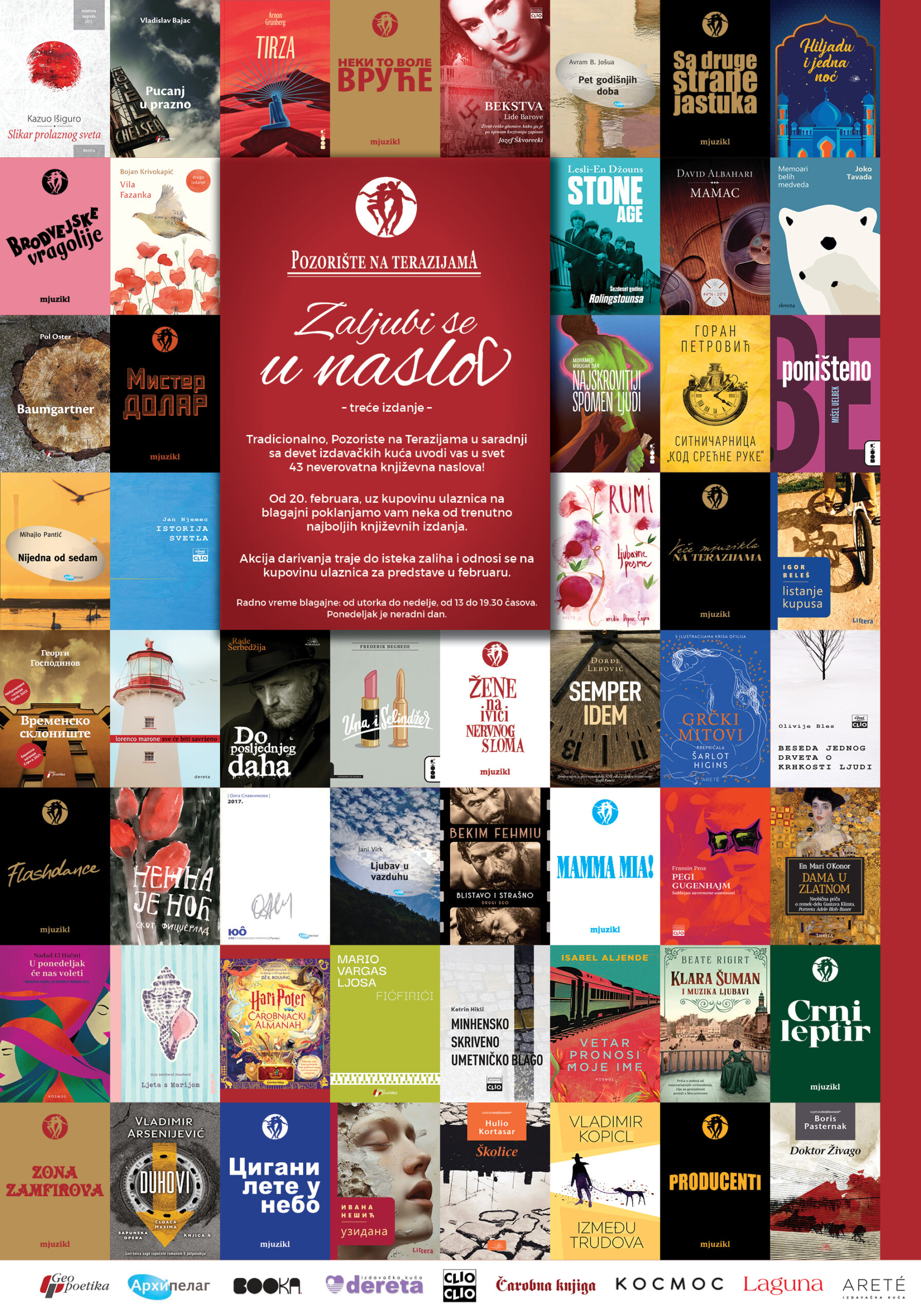U saradnji sa devet renomiranih izdavačkih kuća (Geopoetika, Arhipelag, Booka, Dereta, Clio, Čarobna knjiga, Kosmos, Laguna i Arete), Pozorište na Terazijama već treću godinu zaredom, svoju publiku, vodi u svet književnosti! Ove godine ljubitelji mjuzikla imaju mogućnost za izaberu jedan od 43 izuzetna književna naslova!