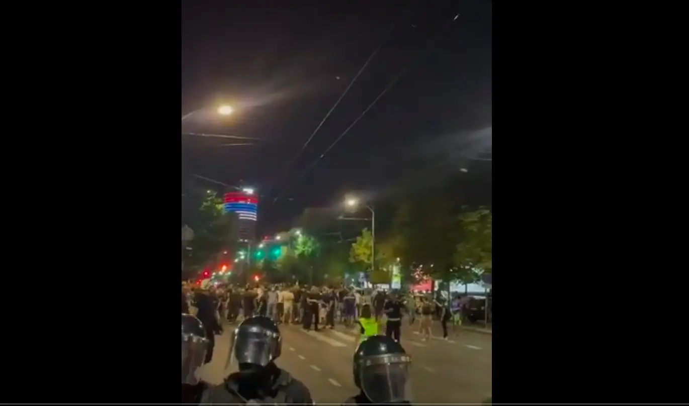 Kordon više desetina pripadnika žandarmerije isprečio se između učesnika protesta koji su oko 20.30 časova pošli ka prostorijama Srpske napredne stranke (SNS) koje se nalaze u ulici Kneza Miloša.