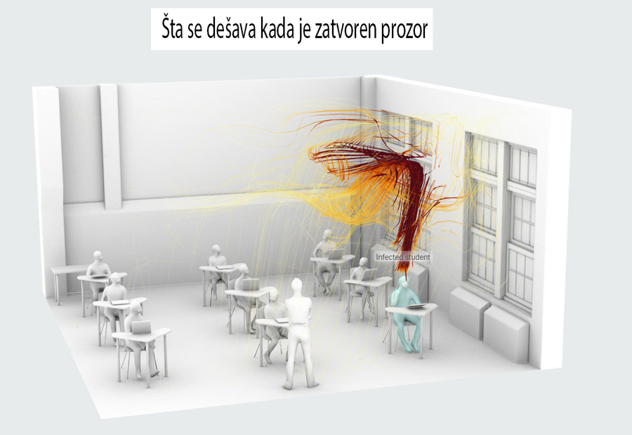 Kako se u SAD povela polemika da li je ventilacija u školama dovoljno kvalitetna da bi u uslovima pandemije mogao da se obezbedi povratak učenika u škole, Njujork tajms je u saradnji sa stručnjacima razvio simulaciju koja nam pomaže da razumemo kretanje vazduha i kako jedno običo otvaranje prozora može da napravi veliku razliku u smanjenju rizika od zaraze koronavirusom. Simulacija je utvrdila da ključnu ulogu mogu da imaju i prečišćivači vazduha.