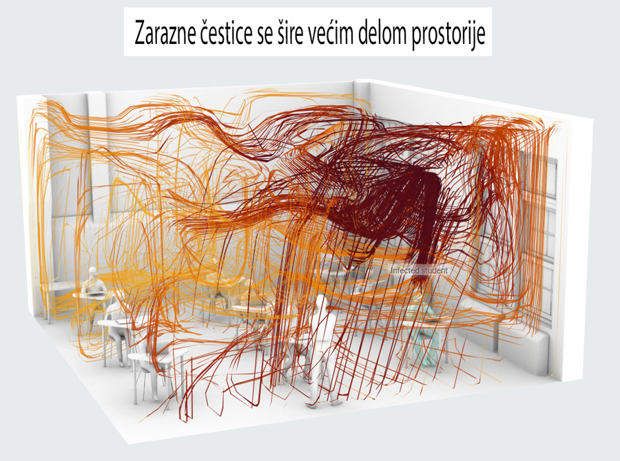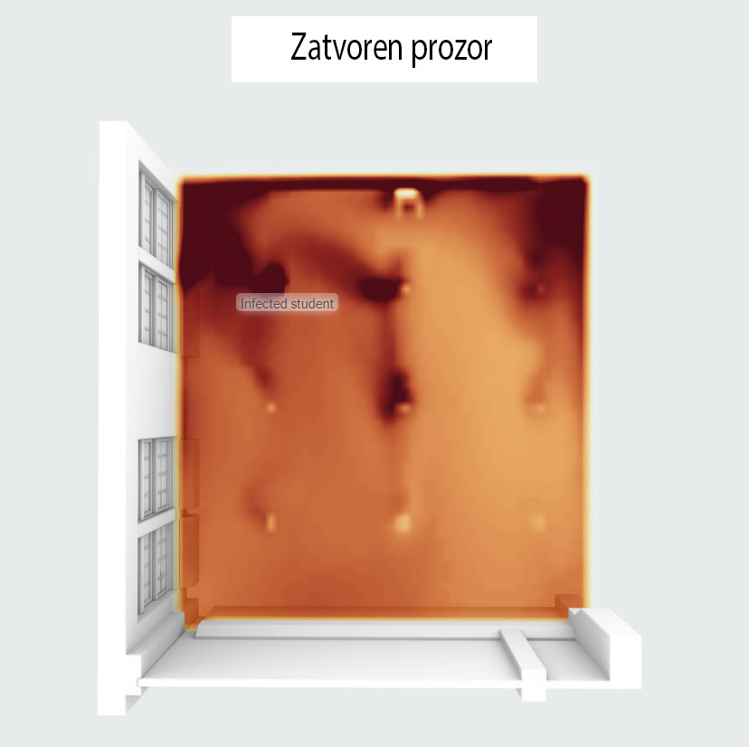 Kada je prozor zatvoren, posle kratkog vremena, u učionici dolazi do vrhunca koncetracije zaraznih čestica, a kako je mala količina svežeg vazduha koji može da uđe zarazne čestice kruže prostorijom.