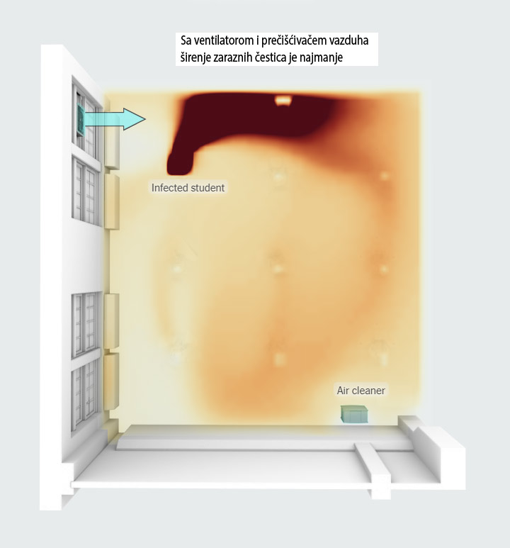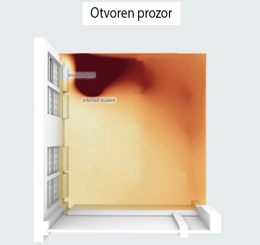Sa otvorenim prozorom koncentracija zaraznih čestica ostaje najveće oko zaraženog studenta, ali izloženost drugih učenika je umanjena.