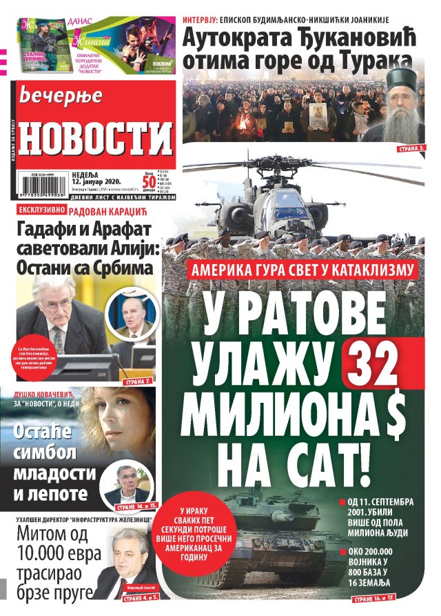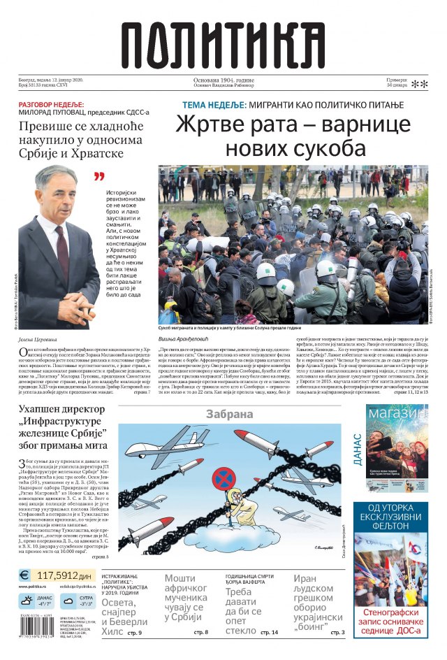 PROTESTI U TEHERANU PROTIV VLASTI – Oko 1.000 ljudi okupilo se u centru Teherana zahtevajući ostavku vrhovnog iranskog verskog lidera ajatolaha Ali Hamneija i cepajući slike nedavno ubijenog generala Kasima Sulejmanija. Demonstranti su tražili kaznu za krivce, a vlasti nazivali „lažovima“ zbog toga što su tek naknadno priznali da je raketom oboren ukrajinski putnički avion. Oni su čak cepali slike generala Sulejmanija, ubijenog u američkom napadu dronovima. „Vrhovni vođo, podnesi ostavku, podnesi ostavku“, „Sulejmani je bio terorista“ bile su parole ispred Univerziteta Amir Kabir u Teheranu. Iranska policija je rasterala studente, zbog „radikalnih slogana“. Policija je rasterala studente kada su izašli iz kruga Univerziteta i hteli da „zatvore ulicu stvarajući saobraćajnu gužvu“, navode mediji.