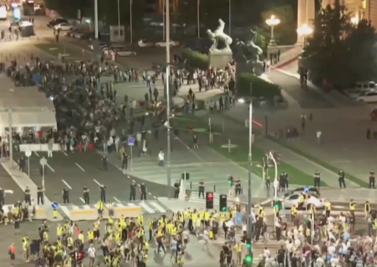 U delu Trga Nikole Pašića, kod Pionirskog parka se mogu videti i pripadnici Žandarmerije sa opremom za razbijanje demonstracije, sa spuštenim vezirima i štitovima.