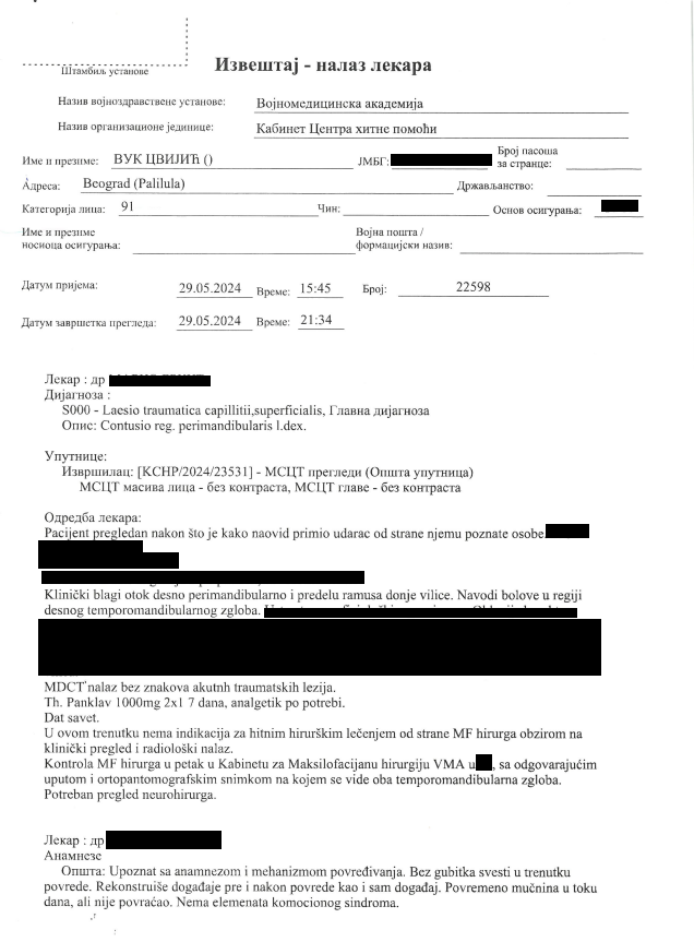 U izveštaju se precizira da Cvijić ima nagnječenje mekih tkiva i dodatno se upućuje na pregled kod maksilofacijalnog specijaliste. Lekar sa VMA odredio je i medikamentnu terapiju.